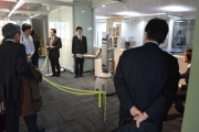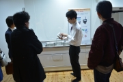 共進化社会システムイノベーション施設内にあるB-Senの内部を参加者に初公開いたしました。B-Sen内には多種多様なセンサーが設置されており、人が実際に生活することで、人の1日の行動情報を収集することが出来ます。収集された情報を基に人の動きを予測する空間シミュレーターによって、“都市OS”の特徴である“サイバー空間(あの世)”から“実世界(この世)”に最適なデータをフィードバックするための基盤開発に向けた実証実験を行うことができます。その他にも、高齢者などの介護に使われる生活支援ロボットや脈拍を測定する車椅子が設置されており、見学に訪れた参加者にB-Sen内にある様々な設備の説明を行いました。