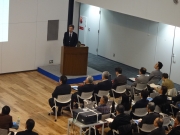 Then the Center Leader Korehisa gave the overall project status and the outlook of phase 1 to phase 2 development. Professor Harada of Kyushu University spoke about “Community Cooperation and Maximizing Locally-generated and Locally-used Renewable Energy for the Purpose of a Disaster Prevention Base Plan,” and Professor Matsuhashi from Tokyo University spoke on a “Model to Calculate the Various Social Implementation Effects of ‘urban OS’”.