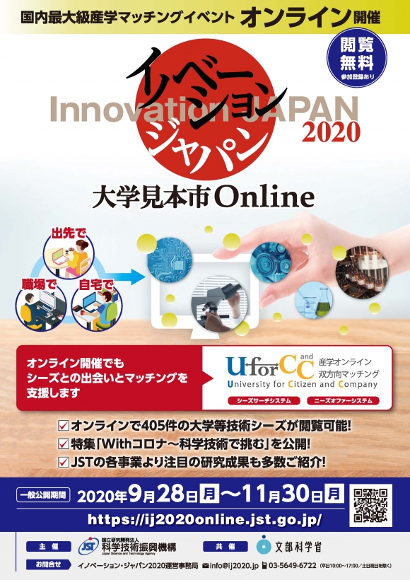 “Innovation Japan 2020 - University Fair” is one of Japan’s largest university-industry collaboration events. This year it will be held online due to the spread of COVID-19.