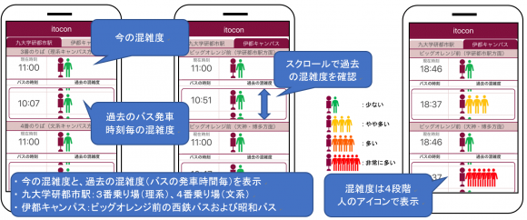 The HumanoPhilic Systems Lab at Kyushu University Graduate School and Faculty of Information Science and Electrical Engineering (Prof. Yutaka Arakawa/Assistant Prof. Shigemi Ishida) and Kyushu University Coevolutionary Research for Sustainable Communities (COI) developed a bus stop congestion visualization app for students and faculty who commute to Ito Campus.