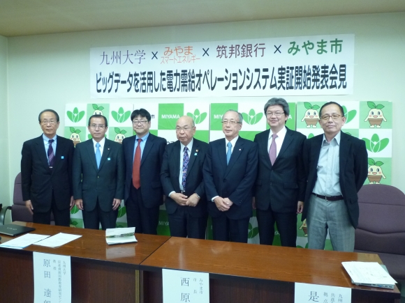 福岡県みやま市(市長 西原 親様)と、国立大学法人九州大学の炭素資源国際教育研究センター、共進化社会システム創成拠点は、11月2日、再生可能エネルギー出力、気象、時間帯、電力消費、消費者行動の関係分析など、いわゆるビッグデータ解析を協力して行い、将来共同で自治体向けソフトウエア開発を目指す内容でのプレス発表を行いました。