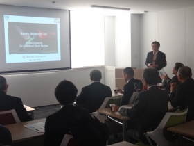 After the explanation on Kyushu University COI initiatives were given in the seminar room on the 3F of the facility, he visited the research rooms in the facility and gained a better understanding by actually seeing the site.He seemed to be very interested, especially in the advanced research toward “visualization of energy” within the facility, organic EL, big sensor box, and the computers in the Mathematics for Industry Unit.