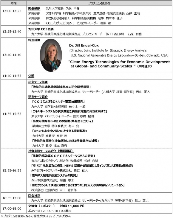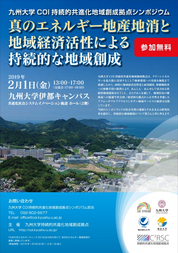 九州大学COI 持続的共進化地域創成拠点は2019年2月1日(金)に共進化社会システムイノベーション施設において、『真のエネルギー地産地消と地域経済活性による持続的な地域創成』をテーマにシンポジウムを開催いたします。